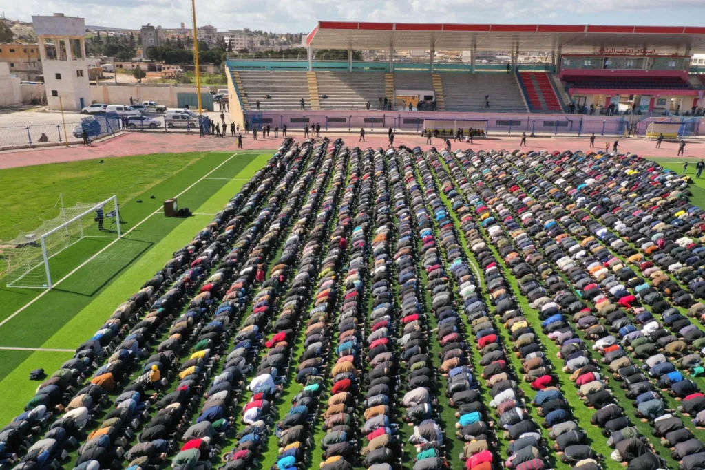 Ratusan warga Idlib memadati lapangan sepakbola pada Jumat (10/3/2023) untuk melaksanakan shalat istisqa. Shalat tersebut diadakan untuk meminta turunnya hujan